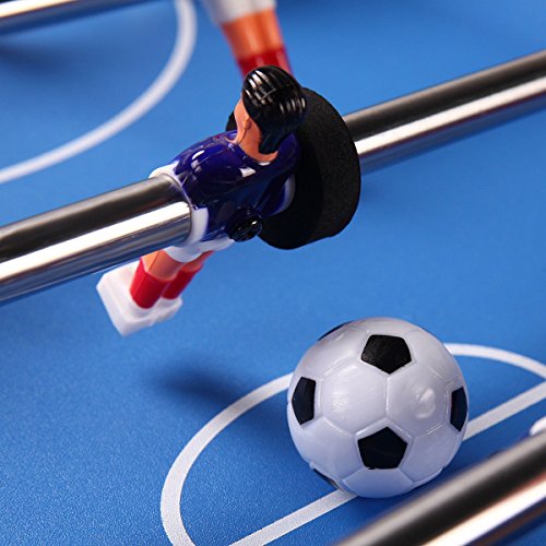 This foosball soccer table is perfect for any indoor amusement between families, friends and colleagues. It features a strong wood construction, solid steel rods with slide bearings for smooth rotation and ball serve cups on both sides for convenience. The foosball table includes players, soccer field and crowd graphics and scoring device on both sides. The 8 rods are included within the table to allow 4 rows per team; 11 red players and 11 blue players; equipped with ball serve cups for convenience; Internal ball retrieval at each goal; Plastic manual slide scorers at each goal; Unified leg panel design with leg spanners on each side; Scoring device to count the game process conveniently and two footballs includedStrong wood construction and solid steel rods. Various sizes - 36" x 18" x 25.6" (L x W x H)8 rods are included within the table to allow 4 rows per team; red team versus the blue team