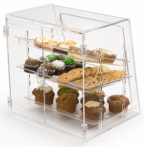 This food display case is typically found in bakeries, delis and restaurants; however the clear acrylic storage container can be used in a variety of settings, including at home and at the office. The tabletop fixture features 3 removable shelves, or trays, on which a user can showcase an assortment of baked goods and treats. The food display case is made entirely of clear acrylic, therefore providing shoppers with a 360 degree view of the displayed items. The countertop container is equipped with 2 openings. The front door is for guests to easily select a baked good, while the back door lets a user update a selection by simply pulling out an entire tray. The top shelf is positioned at an angle optimal viewing. Another great feature of this food display case is the height-adjustability of each shelf. This gives users the ability to present taller items, such as a muffin, without damaging the treat or hindering its presentation.Clear acrylic display lets guests view an assortment of treats from either side of the unit.3 removable trays make inserting new pastries easy.