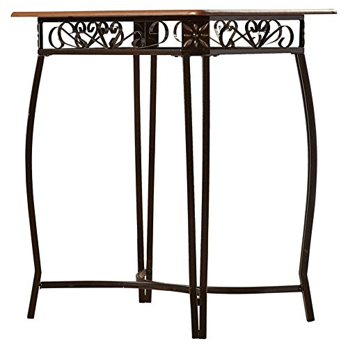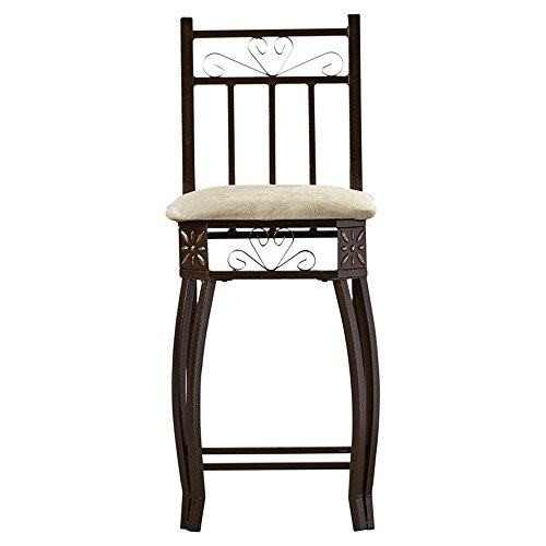 The pub table and two stools are burnished with a bronze finish. All the items in this set have a frame constructed out of wrought iron making them sturdy and durable. The table has a wooden and beveled glass top for a distinctive look. The stools are upholstered with foam filling and beige colored fabric for attractive and comfortable seating.Both chairs can fit under the table on the same sideTraditional Rustic Style