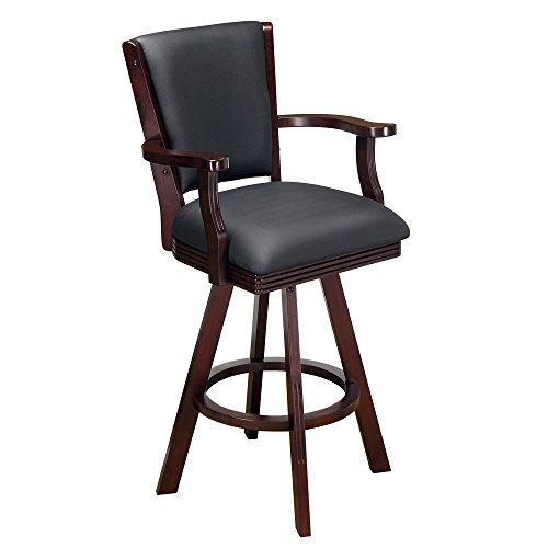 Do you already own a bar or tables and need some sturdy stools to complete your game room furniture grouping? We have durable and beautiful barstools for you at Fairview Game Rooms. This classic barstool is built to last with strong wood and durable faux black leather cushions. The seat swivels 360 degrees. Overall Dimensions: 47" H x 19" W x 25" D ; Overall Weight: 33 lbs ; Seat Height: 31" ; Total Height: 47" ; Foot Ring Height: 11" ; Arm Height: 37.5" ; Outside Arm Width: 24" ; Inside Arm Width: 18" ; Foot Width: 19" ; Foot Depth: 25" ; Seat Depth: 19" ; Seat Width (front): 19" ; Seat Width (Back): 17" . Shipping Dimensions: 24" x 28" x 7" @ 27 lbs ; 21" x 19" x 9" @ 8 lbs .FREE SHIPPING!Sturdy. Built to last
