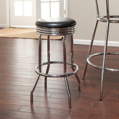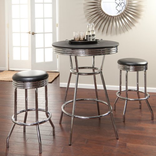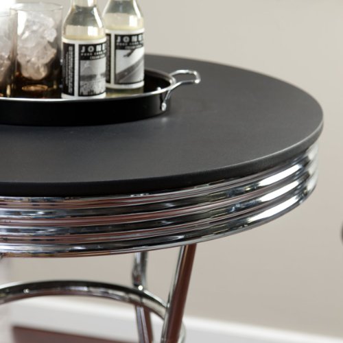 The table has an Easy to Clean Formica Black Table Top. This item is modeled after the famous style of the American 1950's Diner that has served so many back in the days. The tubular steel frame of the item is plated with chrome and constructed with quality. Its smooth, strong and durable surfaces makes it easy to clean and hassle free.Bar Table and 2 Barstools set in 50's Retro Nostalgic Soda Fountain Style with Chrome PlatingThe table has an Easy to Clean Formica Black Table Top The tubular steel frame of the item is plated with chrome and constructed with quality